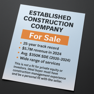For a capable construction professional, this business offers scale, reputation, and continuity—not a passive investment. The seller is motivated to make a win-win transition with an operator who brings both professional competence and personal compatibility.